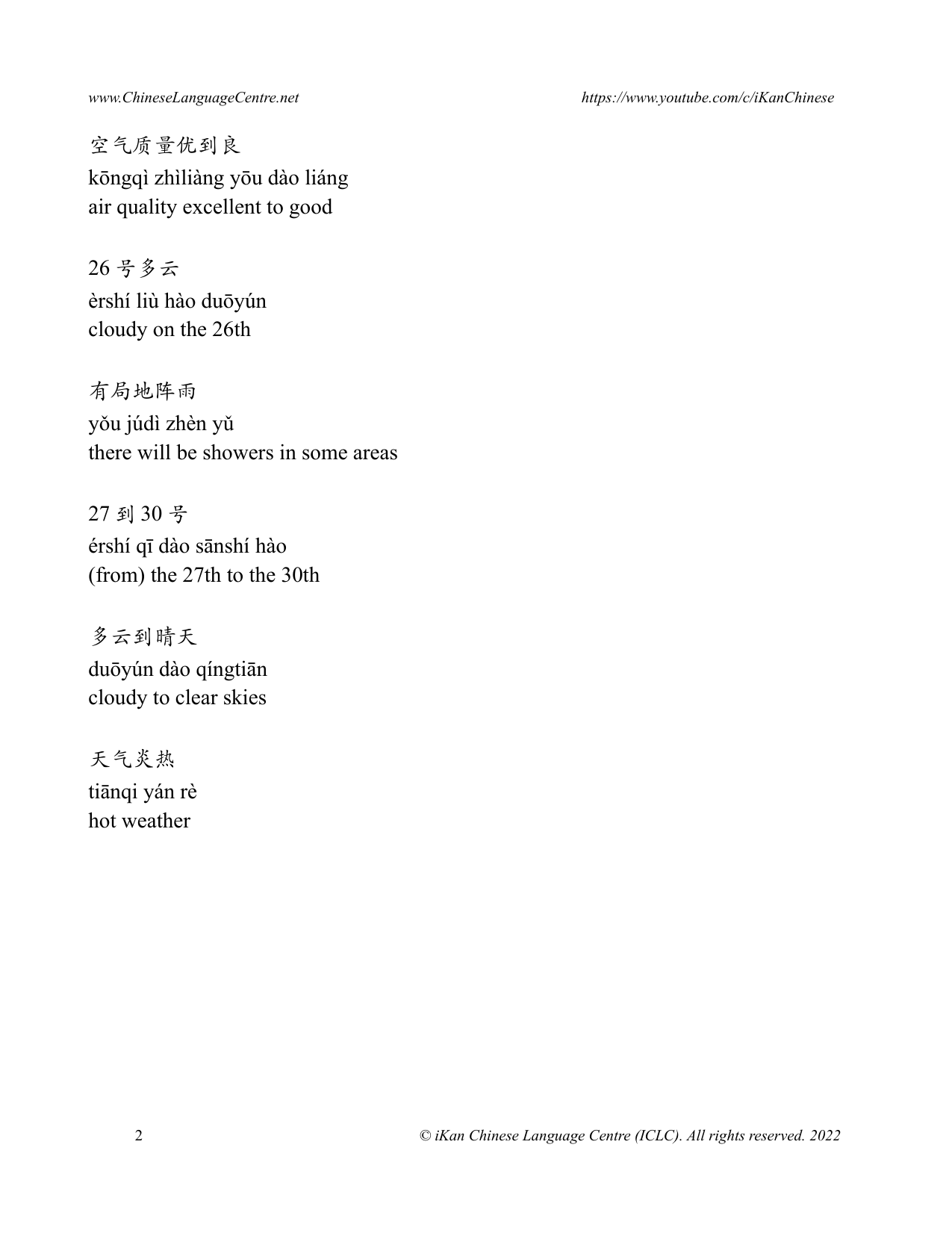 Listen to Weather Forecast aired by China's TV station (in Shenzhen). Every single sentence is thoroughly explained with pinyin and English. Suitable for intermediate and advanced Chinese learners, as well as some advanced beginners.