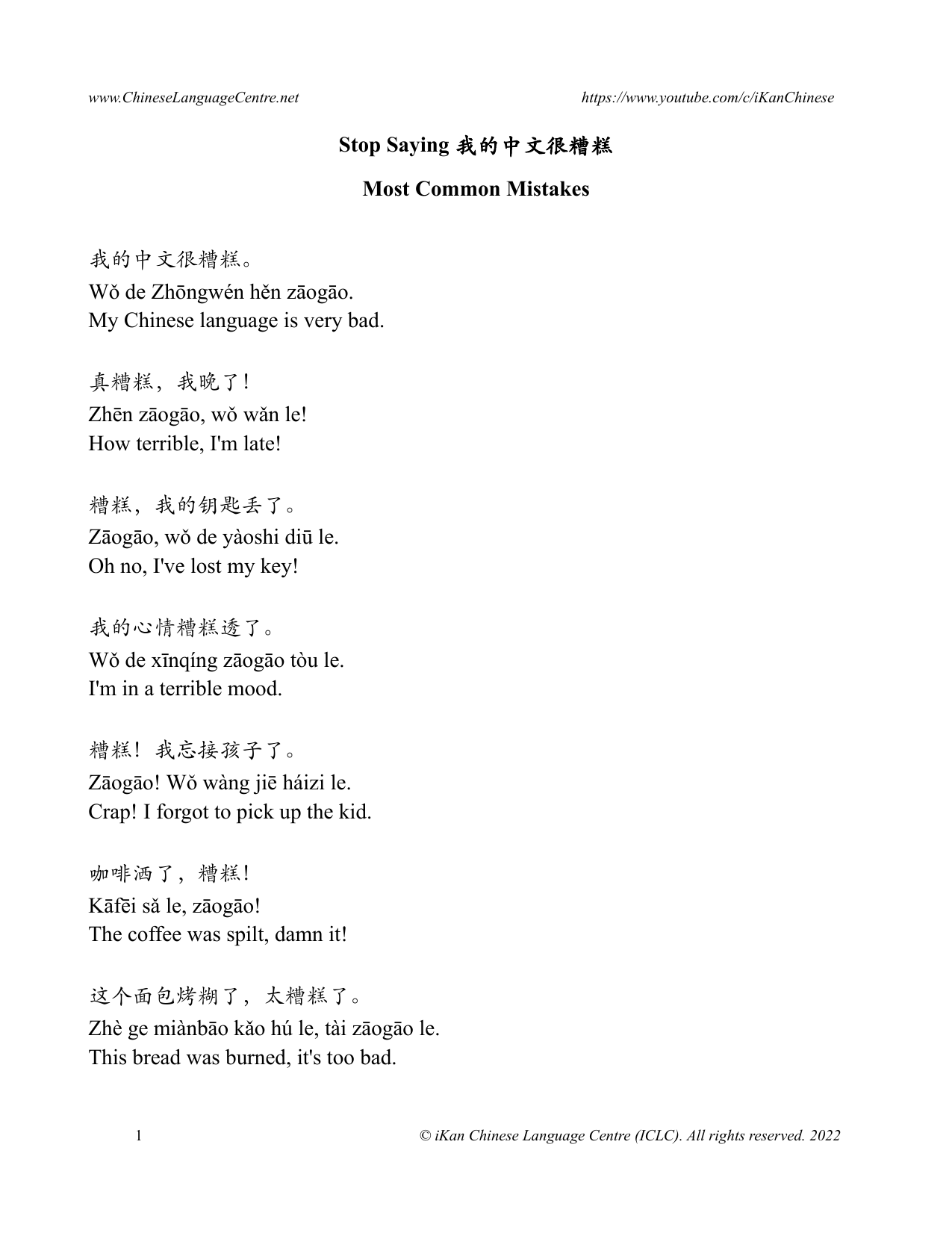 With very practical examples that are commonly used in daily life, the native speaker shows you why we need to stop saying 我的中文很糟糕 (Wo de Zhongwen Hen Zaogao), and how to use the word 糟糕 (zaogao) properly. The vocabulary it covered are mostly HSK 3 to HSK 4.