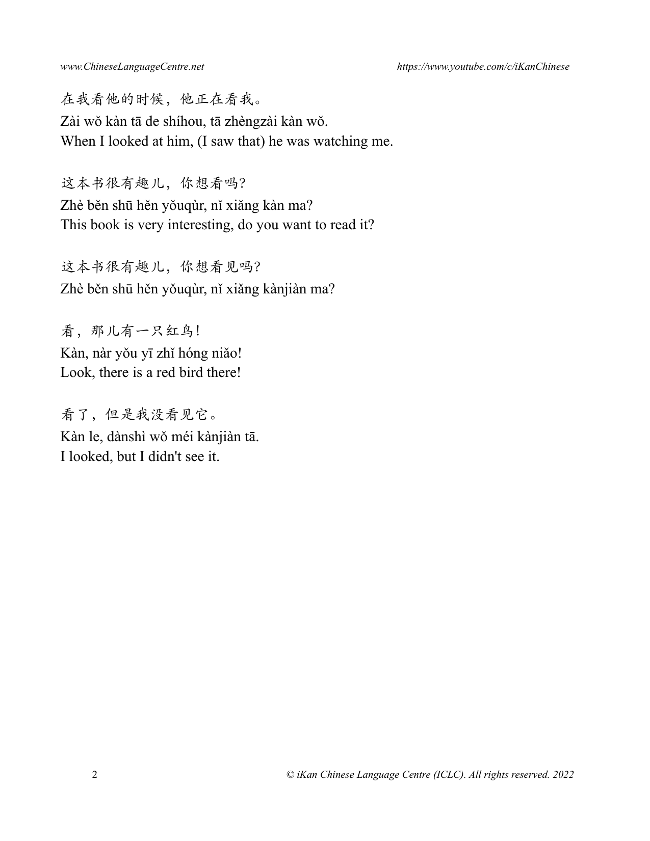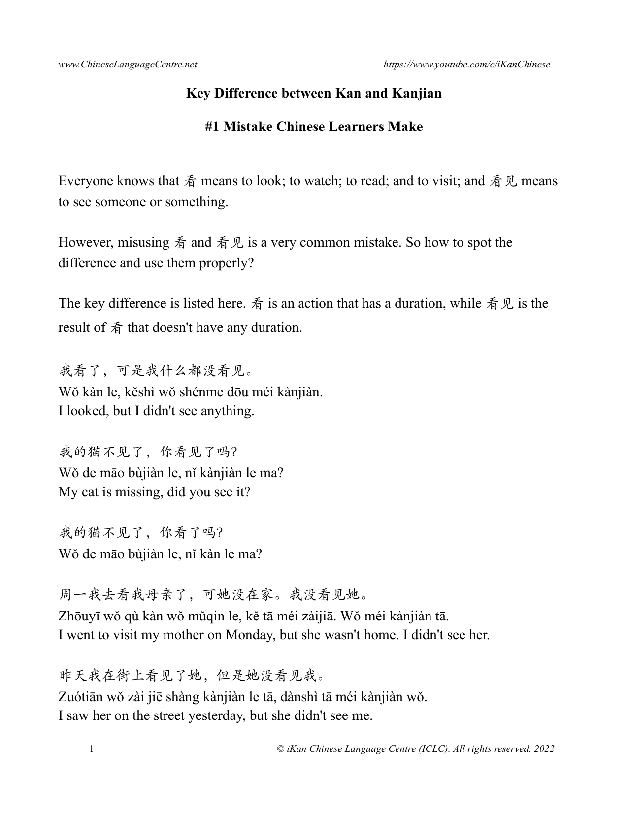 A crystal clear explanation of the key difference between 看 and 看见 is presented, along with some very typical examples. Viewers are expected to be able to use Kan and Kanjian with confidence afterwards.