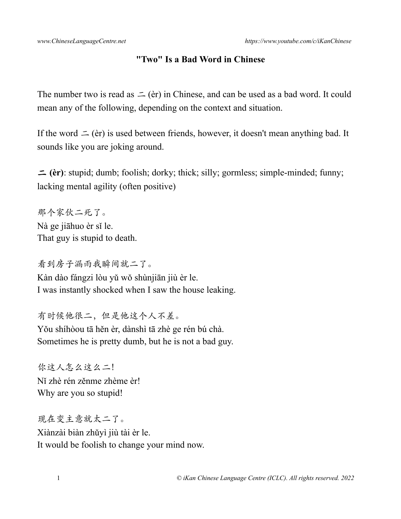 The number 2 (two) is a bad word in Chinese, and can also be used to joke around. 16 examples in the video show how people use it in daily life.